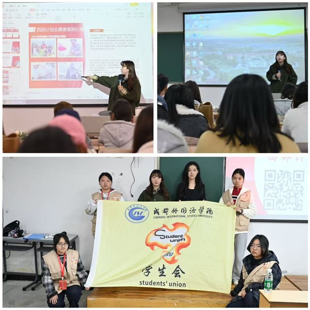 活动伊始,黄老师带领参会者学习习近平总书记给新疆谢依特小学戍边支教西部计划志愿者服务队的回信精神,勉励同学们将个人理想融入国家发展大局。紧接着,黄老师从项目实施背景、核心服务内容、具体招募条件、报名时间节点、志愿者选报方式、备考要点等方面展开系统全面的讲解,为同学们提供了清晰的、实用的行动指南;同时,分享了我校西部计划优秀志愿者的经历——杜明勋(服务于重庆市忠县金声乡人民政府)、何彩容(服务于四川省巴中市通江县思源实验学校)、钟媛(服务于巴中市南江县光雾山镇人民政府)、陈乔美蕙(服务于新疆维吾尔自治区伊犁哈萨克自治州昭苏县委组织部)、张珈铭(服务于重庆市城口县咸宜镇人民政府城建办),生动展现了新时代青年扎根基层、实干担当的精神风貌,让在场同学深受触动。